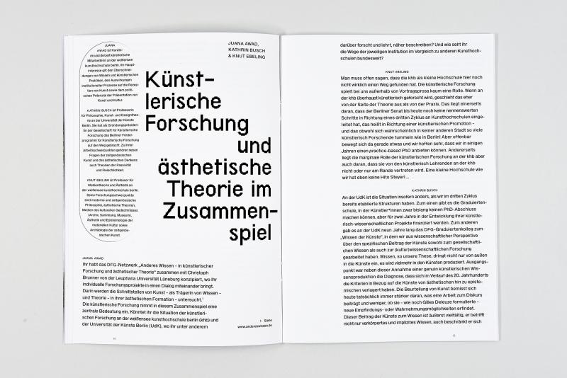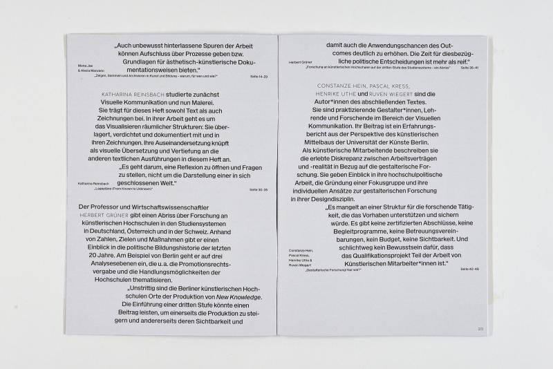 Unser Ziel war es nicht, ein Buch mit Definitionen, Zusammenfassungen oder Ergebnissen einer Diskussion zu veröffentlichen, in der andere Akteurinnen schon viel länger aktiv sind als wir, sondern die vielen Formen zu sammeln und zu verbreiten, in denen künstlerische und gestalterische Forschung an der weißensee kunsthochschule berlin praktiziert und gedacht werden. Aus diesem Grund haben wir einen Open Call an alle Mitglieder der Hochschulgemeinschaft gerichtet. So kamen 39 Autorinnen zusammen – darunter Lehrende, Studierende und weitere Interessierte aus unterschiedlichen Fachgebieten – und eine Vielzahl an Texten in Form von Essays, Abhandlungen, Dialogen, künstlerischen Text- und Bildbeiträgen und Projektdokumentationen. Diese Einreichungen werden in der Publikation um fünf zentrale Achsen konstelliert, die sich bei der Lektüre neben den Fragen aus den einzelnen Vorträgen ergaben und die wir in Begriffspaaren zusammengefasst haben: Strukturen & Institutionalisierungen, Grenzen & (Un-)Disziplinierungen, Kollaborationen & Laboratorien, Prozesse & Dynamiken, Polyphonien & Verflechtungen. Dies sind offene Vorschläge für eine erste Lektüre der Beiträge; es könnte durchaus sein, dass sie neu gemischt und in einer ganz anderen Reihenfolge und Lesedramaturgie zusammengestellt werden. Es sind die vielfältigen Beziehungen, die neue Fragestellungen und Wege des Explorierens aufzeigen.
